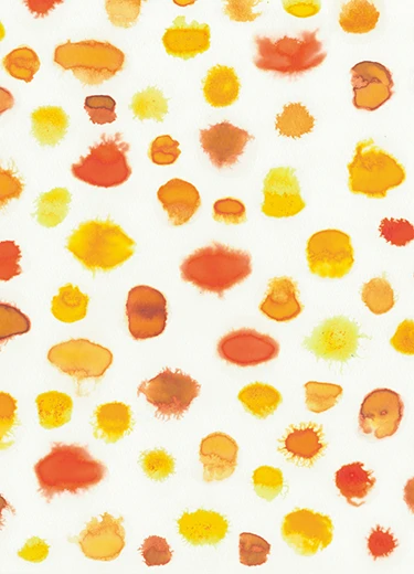白地ににじむオレンジの水玉が広がるアートは、フルーツのやさしい甘味とスパイス感のバランスを視覚的に表現しています。温かみのある色合いが、毎日食べても飽きない味わいの世界観に寄り添います。