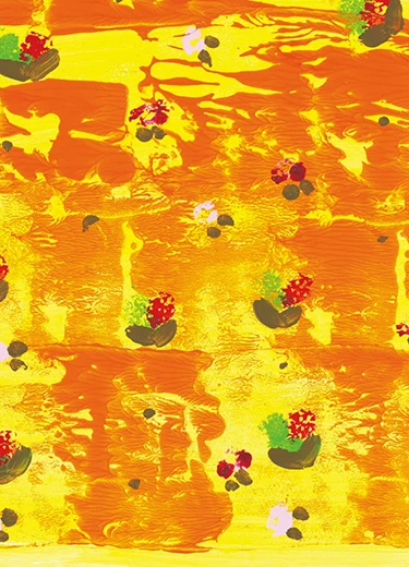 黄色に橙を重ねた背景に赤・緑・茶のモチーフが広がるアートは、フルーティーな甘味とスパイスの香りの広がりを表現しています。異国情緒あふれる色彩が、ポークビンダルーの深みを鮮やかに引き立てます。